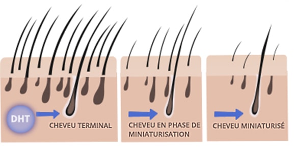 La miniaturisation des follicules pileux est un processus principal associé à la calvitie, particulièrement l’alopécie androgénétique. Sous l’effet de la dihydrotestostérone (DHT), une hormone dérivée de la testostérone, les follicules deviennent progressivement plus petits. Cela raccourcit la phase anagène, durant laquelle les cheveux poussent activement, et allonge la phase télogène, où les cheveux tombent. Les cheveux produits par ces follicules deviennent alors de plus en plus fins, courts et clairs, perdant leur densité et leur volume. Finalement, les follicules miniaturisés cessent de produire des cheveux visibles, entraînant des zones de calvitie. Ce phénomène est influencé par des facteurs génétiques, hormonaux et environnementaux. Si le processus n’est pas arrêté, il peut conduire à une calvitie complète dans certaines zones spécifiques. Heureusement, des traitements peuvent ralentir cette progression en bloquant la DHT ou en stimulant la croissance des cheveux.